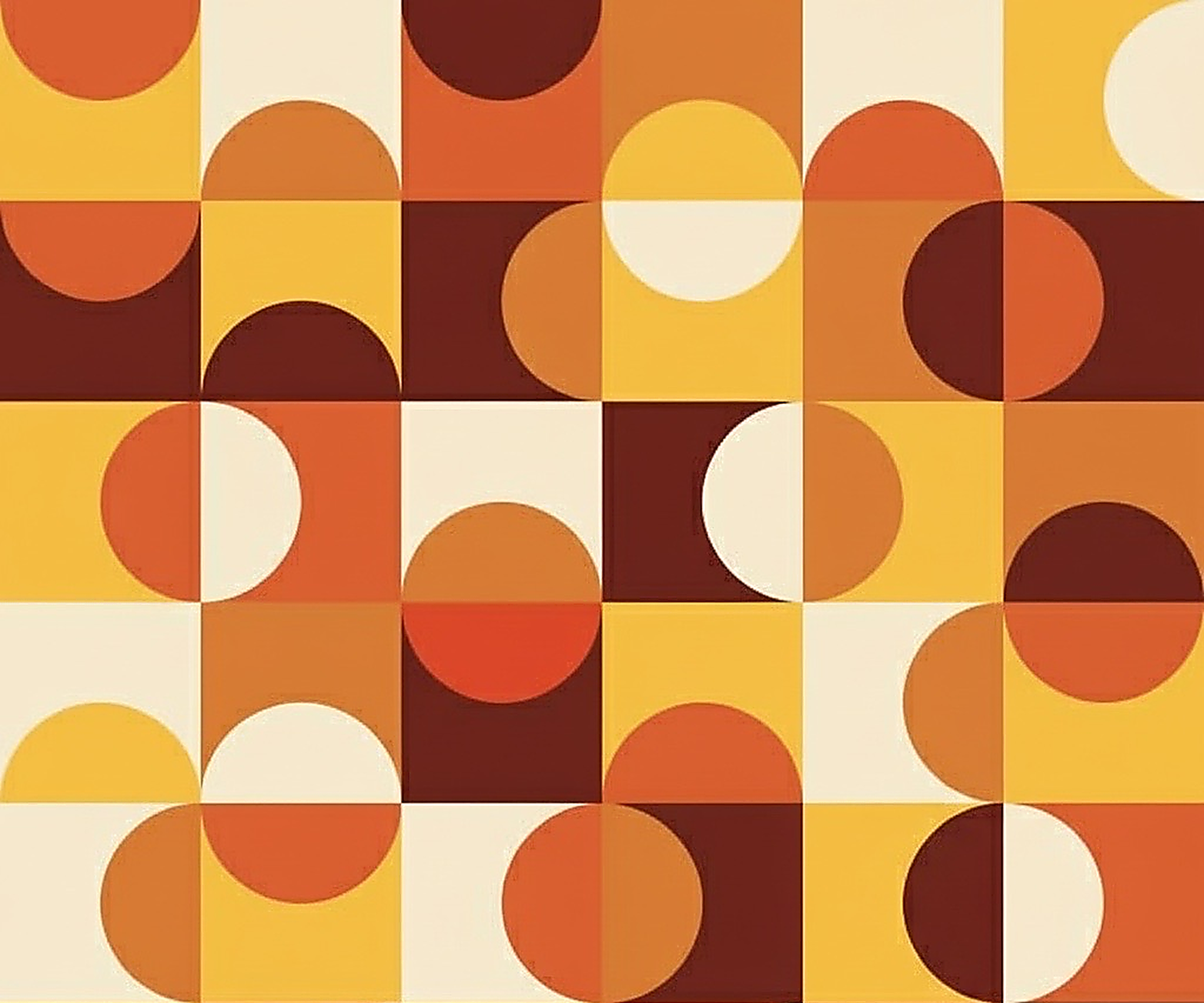 Retro geometric pattern with circles and squares in orange, mustard, cream and brown tones