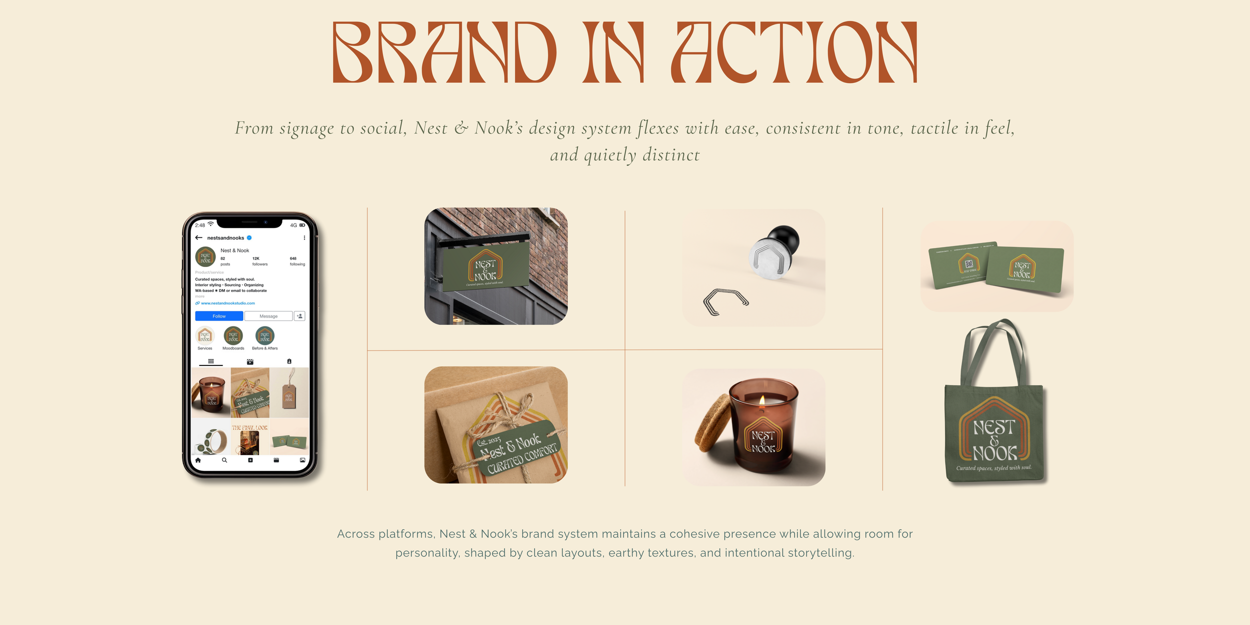 • A branding presentation webpage showing various Nest & Nook branding elements including a phone displaying the Instagram profile, a storefront sign, branded tags, a tote bag, a candle with a cookie, and packaging materials, along with a description of the brand's design system and its cohesive visual identity.