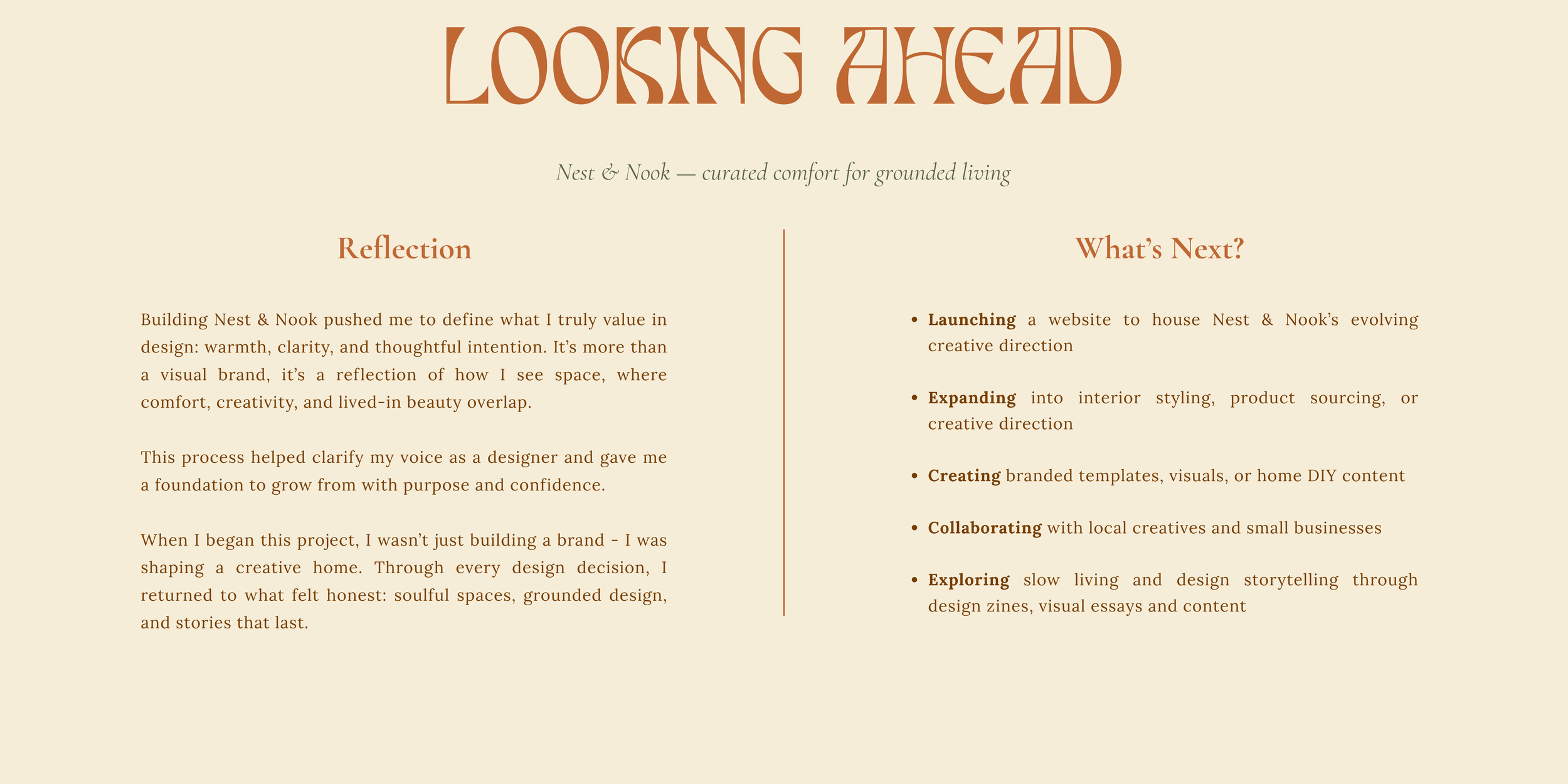 • A beige webpage with the title 'LOOSING AHEAD' in large, stylized brown font. Below, a subtitle reads 'Nest & Nook — curated comfort for grounded living'. The page is divided into two sections: 'Reflection' on the left and 'What’s Next?' on the right. The Reflection section contains a paragraph about defining value in design, and the What’s Next? section lists bullet points about launching, expanding, creating, collaborating, and exploring.