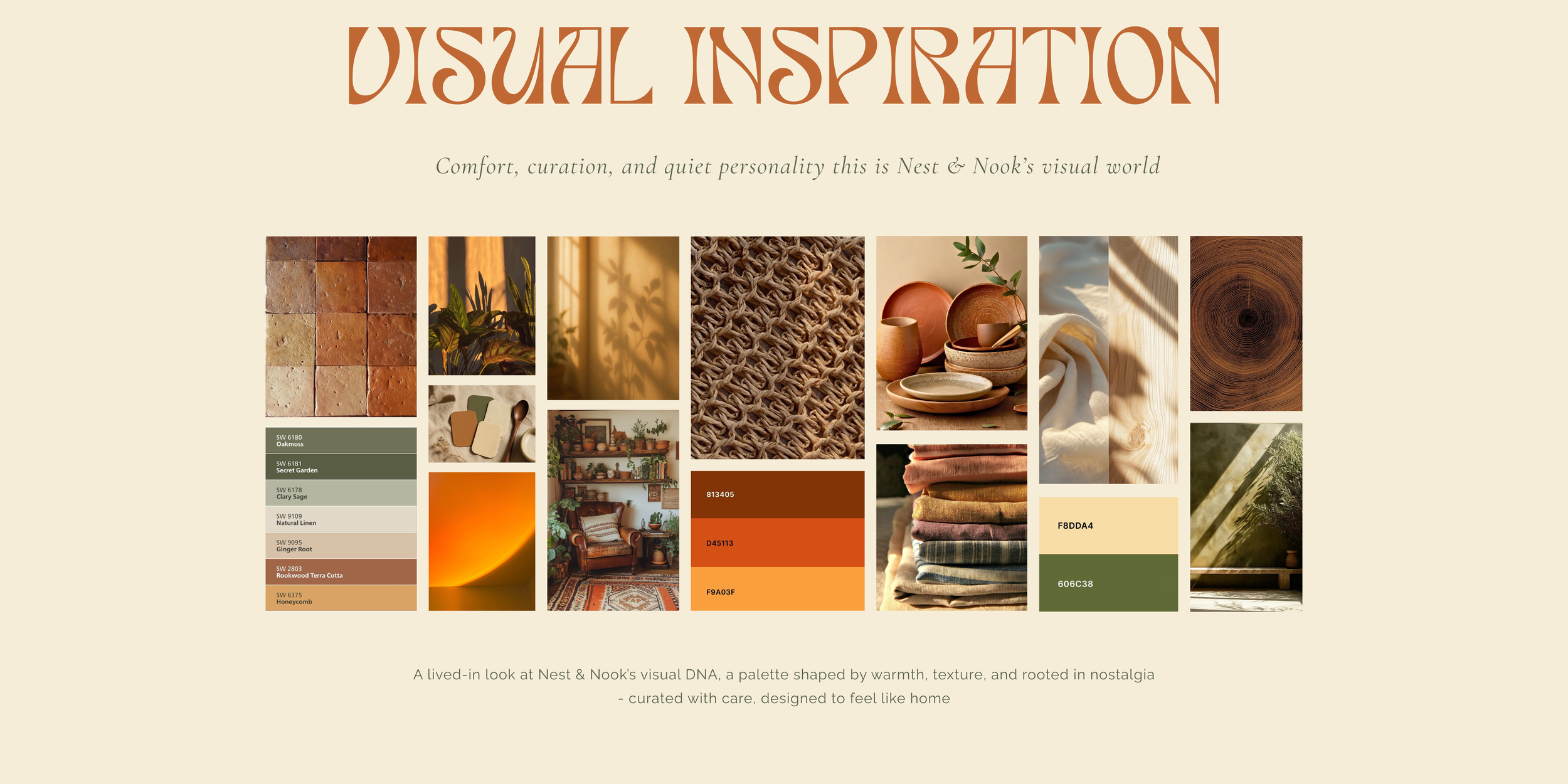 • A mood board titled 'Visual Inspiration' featuring earthy tones, textures, and natural objects. It includes images of bricks, plants, shadows, woven fabric, pottery, fabric swatches, interior decor, wood, Oatmeal, Secret Garden, Clary Sage, Natural Linen, Ginger Root, Rockweed Terra Cotta, Honeycomb, and color palettes with warm shades of orange, brown, and green. Text describes a curated palette inspired by warmth, texture, and nostalgia, designed to create a feeling of home.