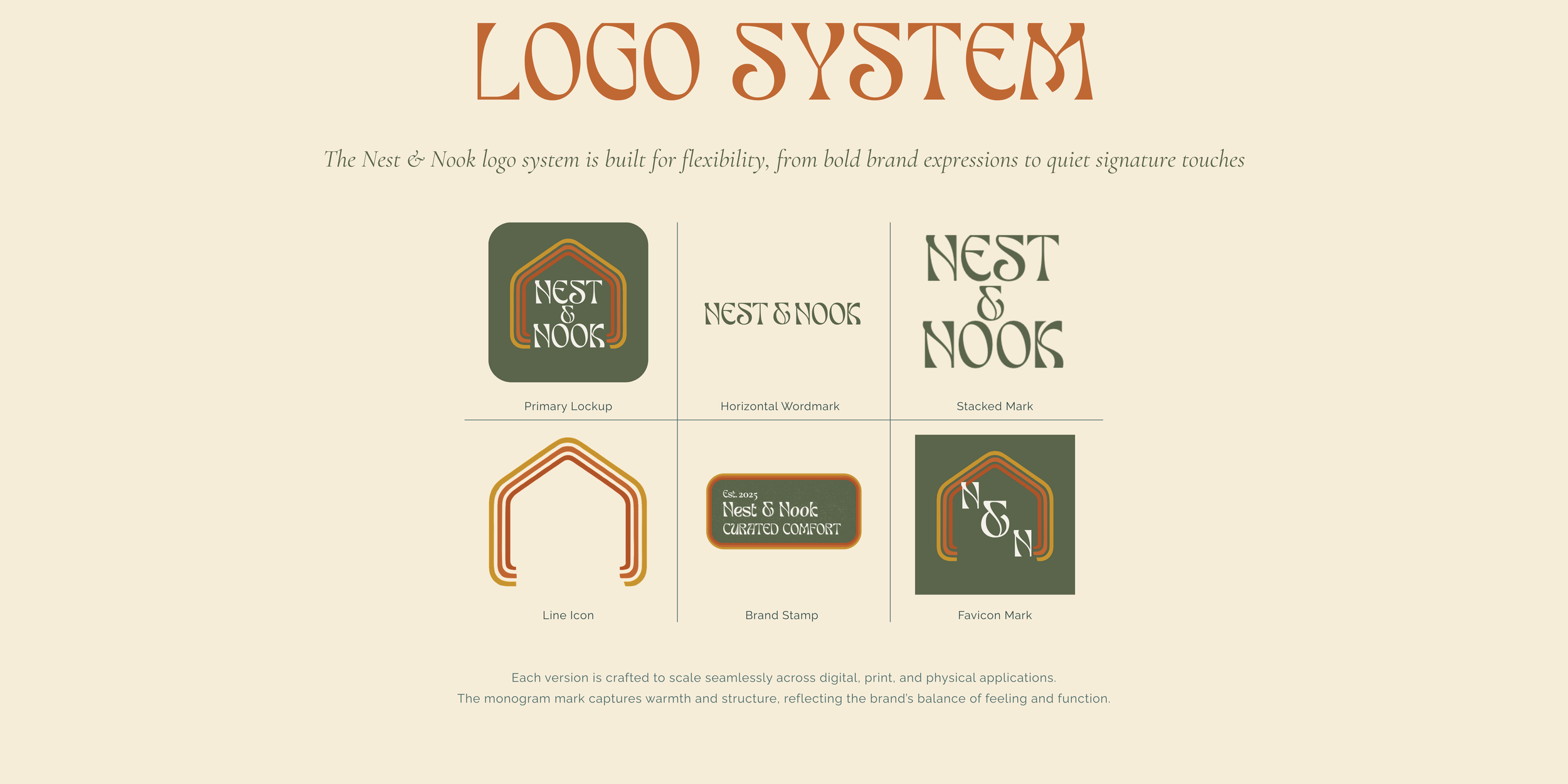• A branding style guide page titled "LOGO SYSTEM" with descriptions of different logo components, including a primary lockup, horizontal wordmark, stacked mark, line icon, brand stamp, and favicon mark, all featuring designs with the text "Nest & Nook."