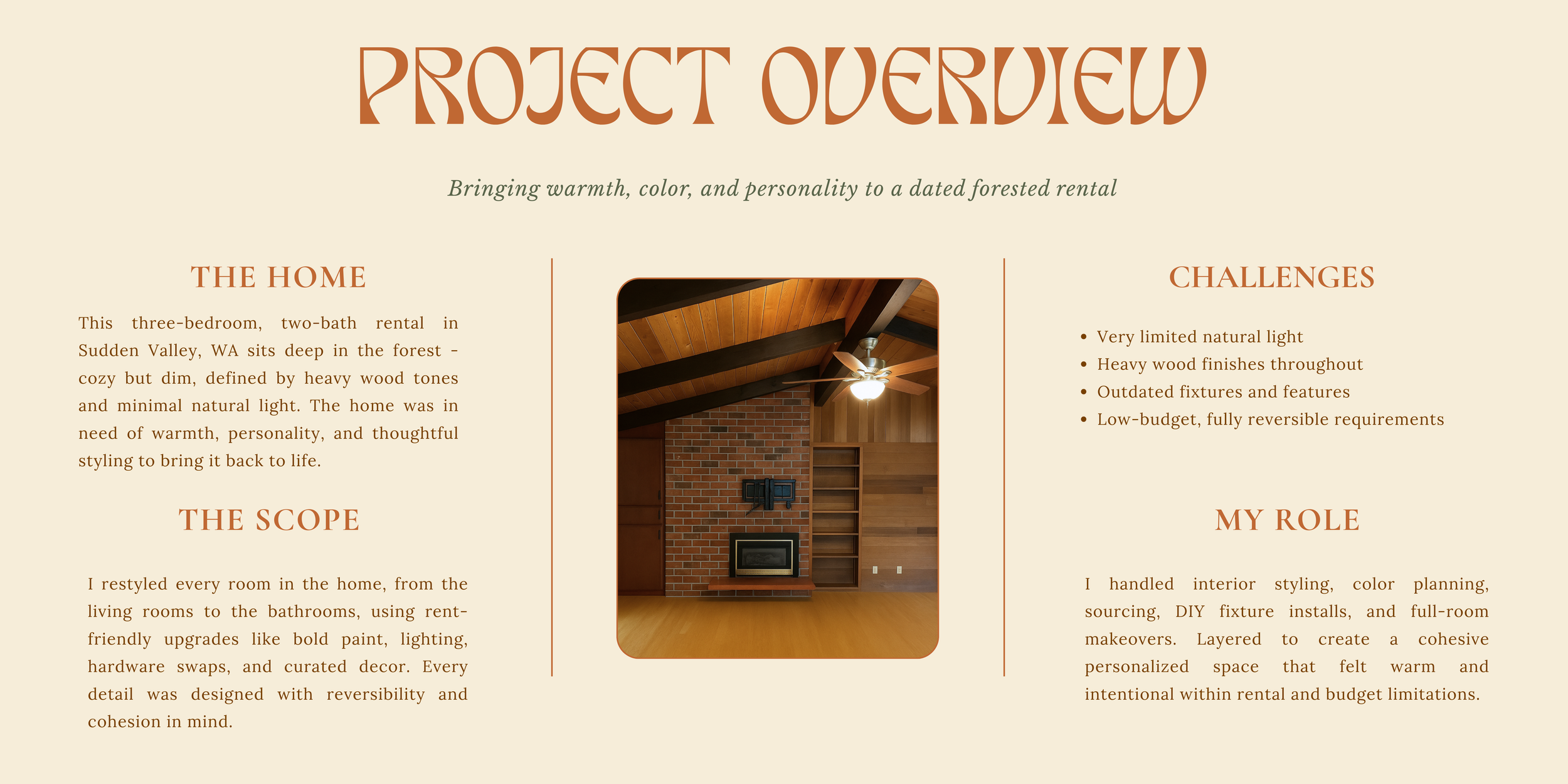 • Project overview page with a photo of a living room featuring a wooden ceiling, brick fireplace, and wood paneling, along with sections describing the home, scope, challenges, and the creator's role.