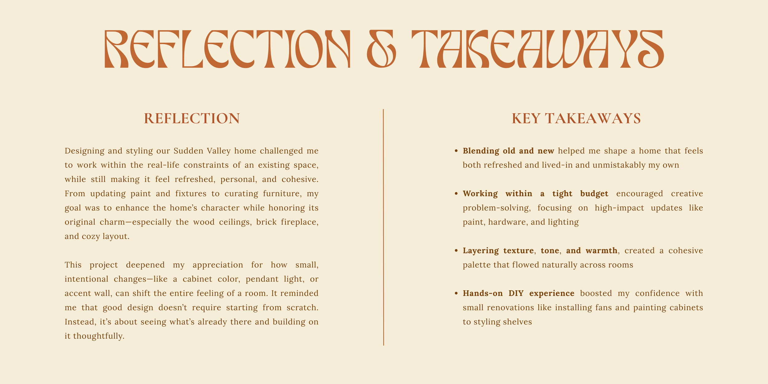 • A design board with the title 'Reflection & Takeaways'. The left side titled 'Reflection' contains a paragraph about home renovation insights. The right side highlights key takeaways, including blending old and new, working within a tight budget, layering texture, tone, and warmth, and hands-on DIY experience.