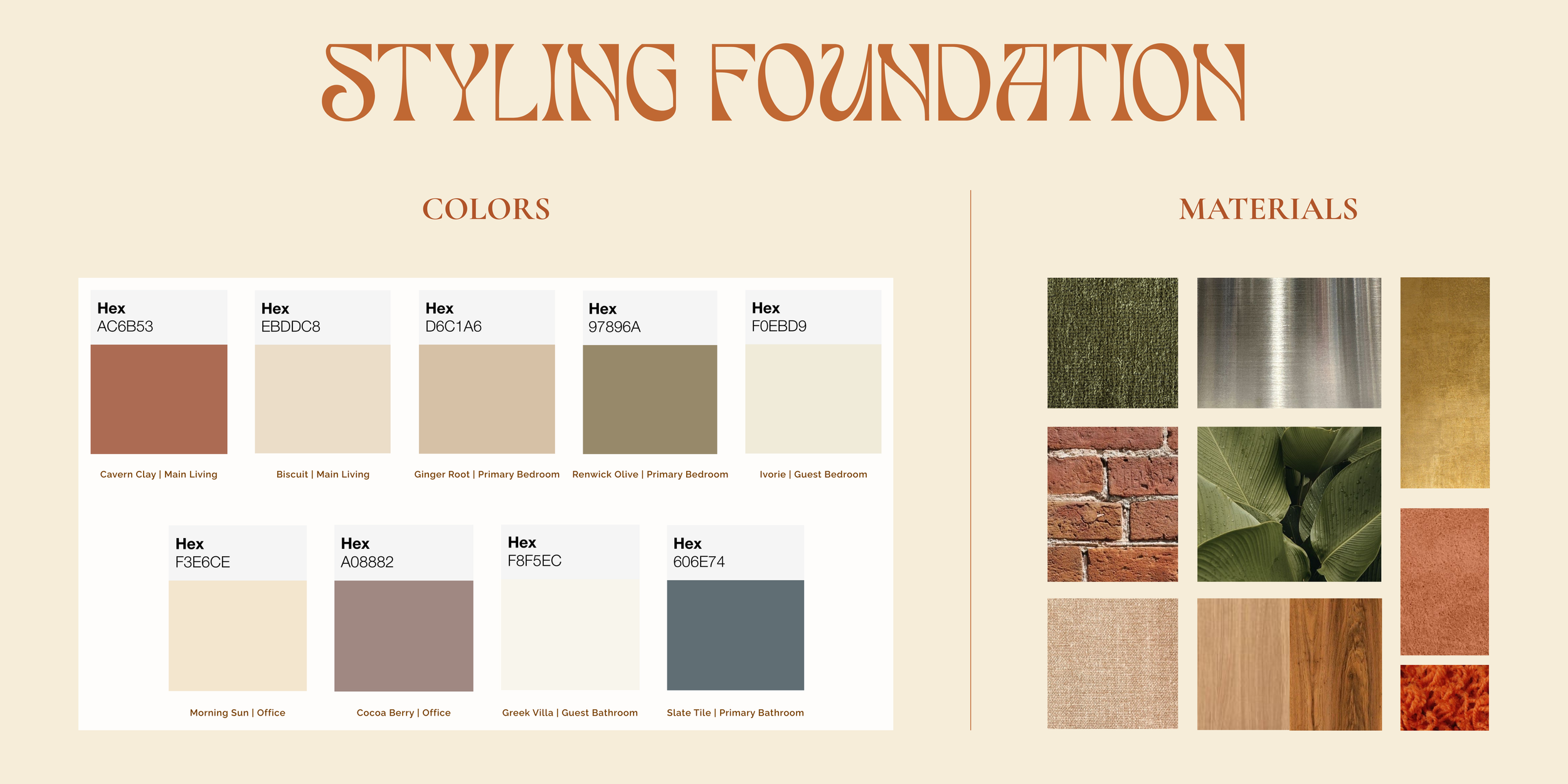 • Interior design mood board displaying color palette with hex codes and material samples. The left side shows a range of earth-tone paint colors with labels and room references. The right side features material swatches including fabric, metal, brick, plant leaves, wood, and a textured fabric sample.