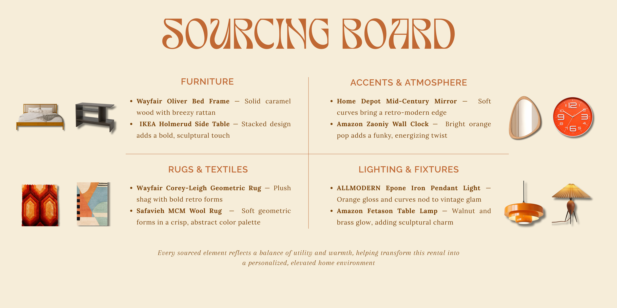 • A home decor sourcing board divided into four categories: Furniture with images of a bed frame and side table; Accents & Atmosphere with images of a mirror and wall clock; Rugs & Textiles with images of a geometric rug and wool rug; Lighting & Fixtures with images of a pendant light and table lamp.